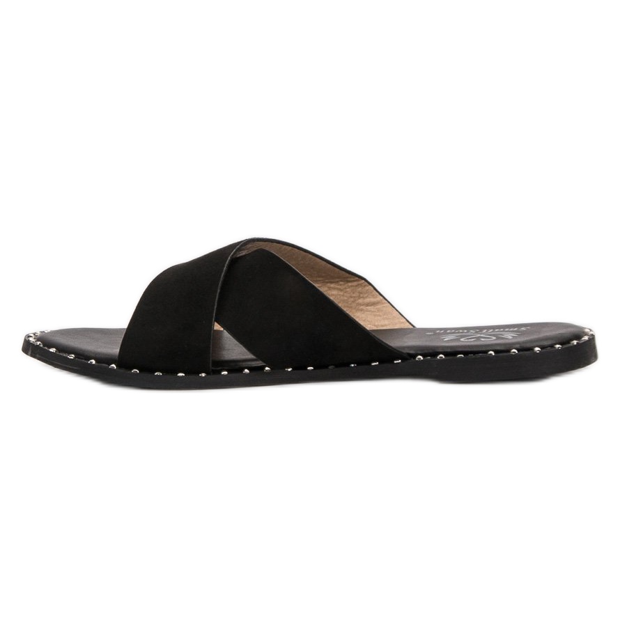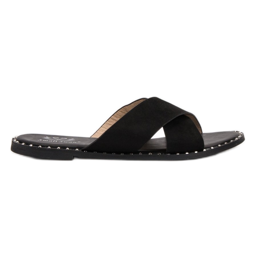 **Small Swan Black Wildleder zehenstegsandalen** ist ein ideales Angebot für Frauen, die jeden Tag Wert auf Komfort und Stil legen. Diese Pantoletten aus umweltfreundlichem Wildleder vereinen Schlichtheit mit modischen Details.