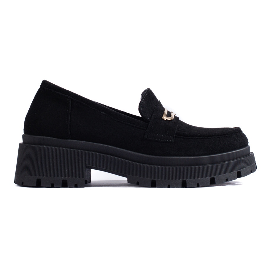Bei der Auswahl der schwarzen Shelovet-Wildledermokassins für Damen konzentrieren wir uns auf zeitlose Farben, die in jeder Garderobe großartig aussehen. Das Obermaterial ist ein Wildlederimitat, das die gesamte Oberfläche des Schuhs bedeckt und ihm einen eleganten Charakter verleiht. Die Kombination aus Kunstleder und Naturleder im Inneren sorgt wiederum für angenehmen Tragekomfort und Langlebigkeit. Die Innensohle aus ökologischem Leder ist fußfreundlich und sorgt für eine gute Atmung.