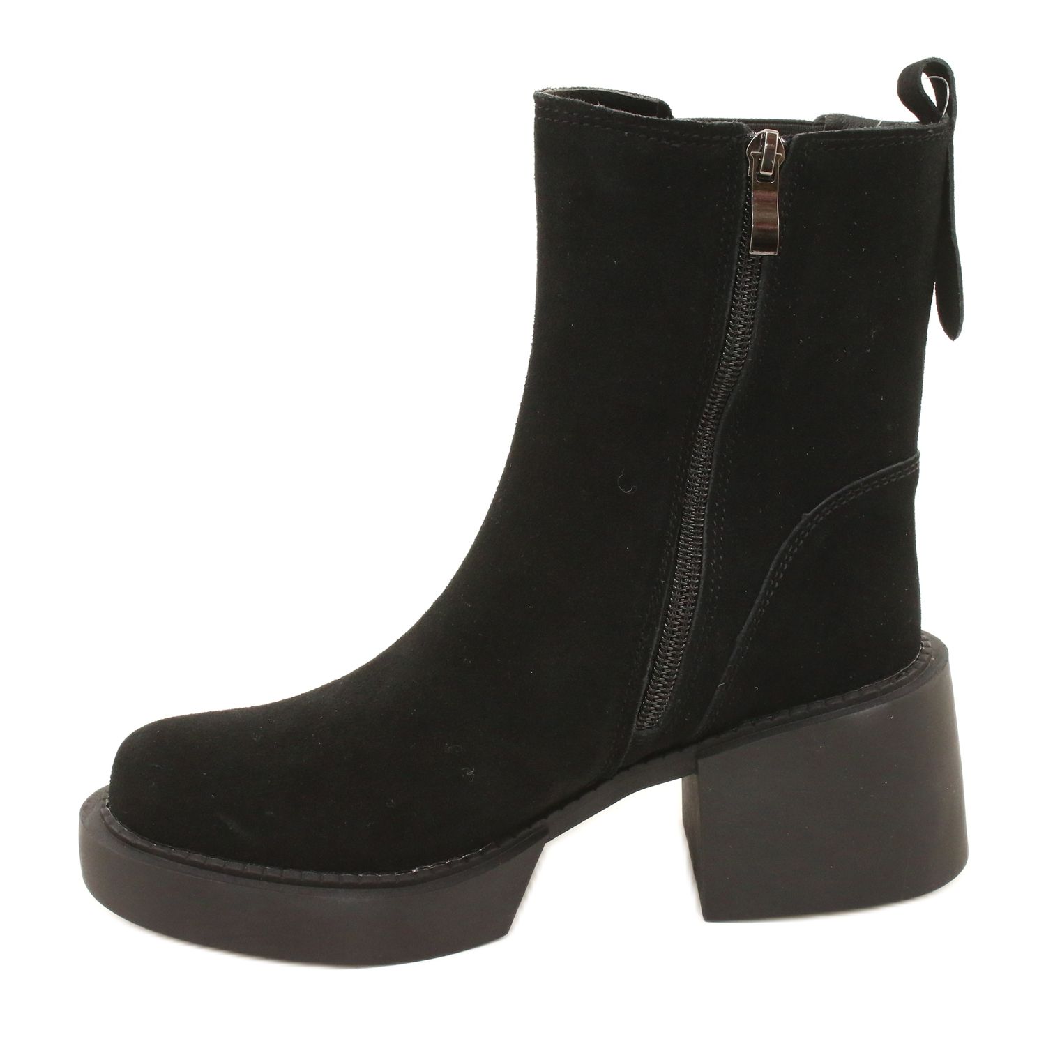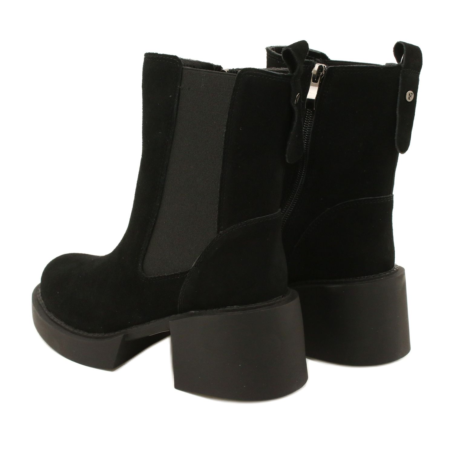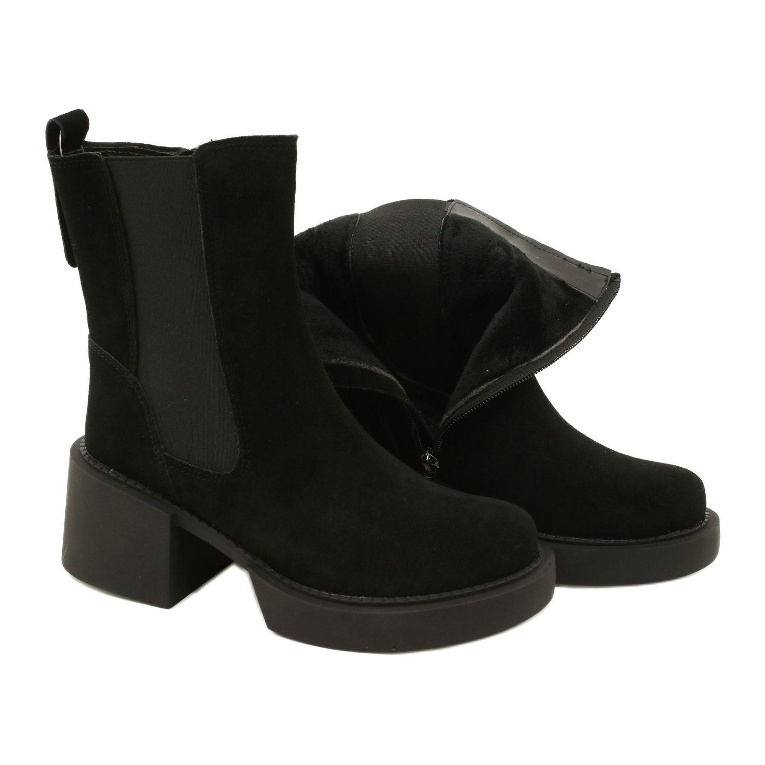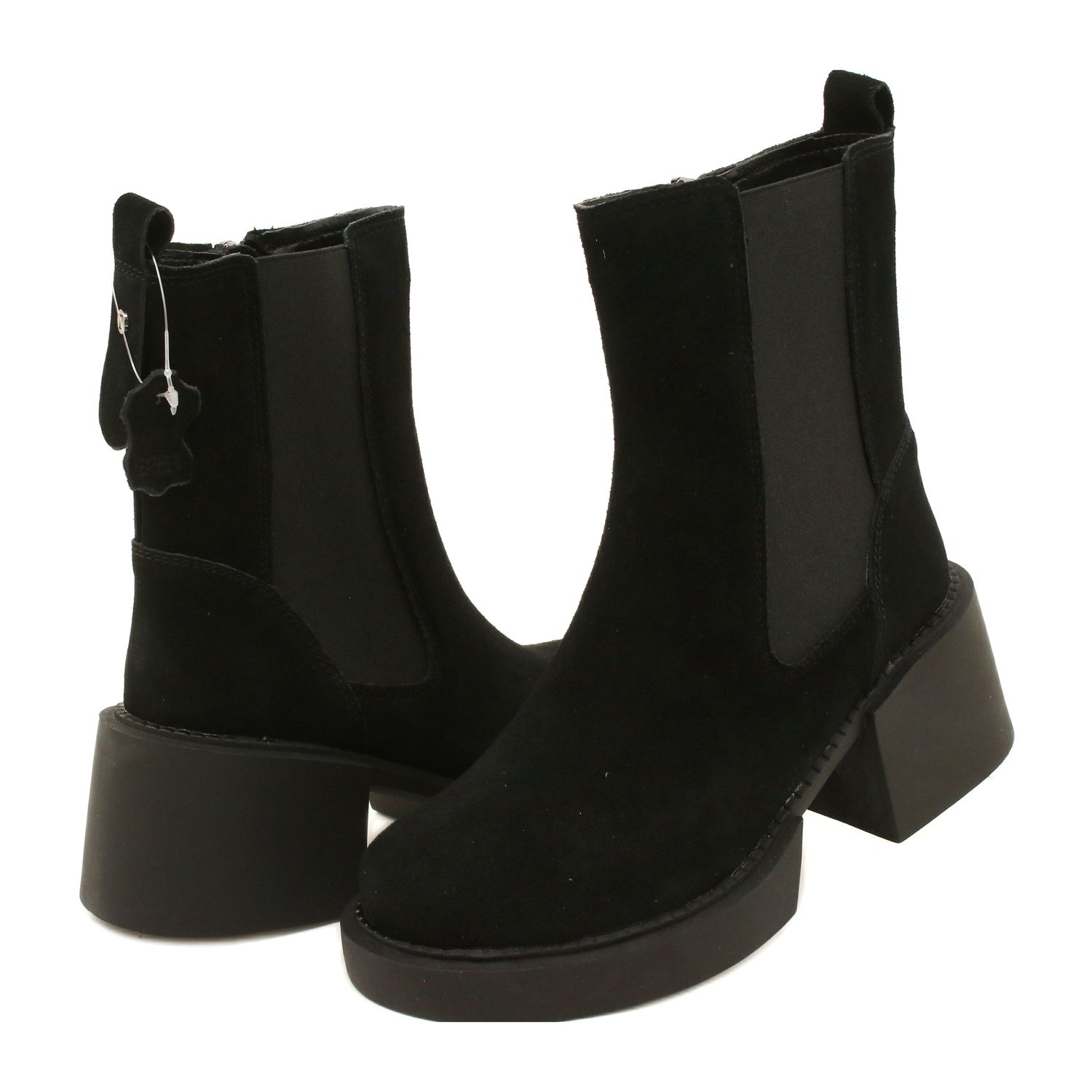 Elegante, zeitlose Stiefel, die Klassiker mit einem modernen Stil kombinieren. Hergestellt aus natürlichen Wildlederleder in intensivem Schwarz, mit vorsichtigem Finish und Details, die den Komfort des Tragens erhöhen. Eine breitere, stabile Ferse wie ein Block (6 cm) und ein subtiler, runder Zeh sorgt den ganzen Tag über den Komfort, und das weiche, schwarze Fell im Inneren erwärmt sich auch an kühleren Tagen effektiv. Das Schloss erleichtert es einfacher, sich schnell anzuziehen, dank welcher Stiefel sowohl für den alltäglichen als auch für formellere Stilisierungen.