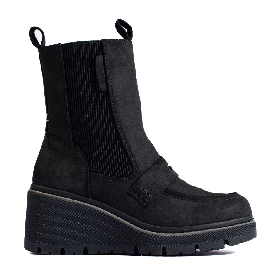 Elegant, schwarze Stiefel der Frauen in Schwarz - perfekt für kühlere Tage. Das Modell für den Knöchel eines stabilen 7 -cm -Keils aus ökologischem Leder mit Wildledertextur mit Isolierung und praktischem Reißverschluss.