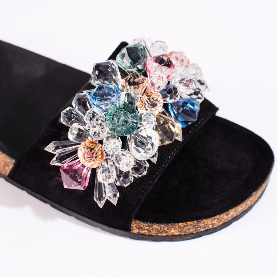 Plastiksohle mit einem Profil garantiert Stabilität und Haftung, ideal für Spaziergänge durch die Stadt oder Entspannung im Garten. Ein zusätzlicher Vorteil ist das subtile Detail in Form von Strasssteinen, die den Klappen einen einzigartigen Charakter verleihen.