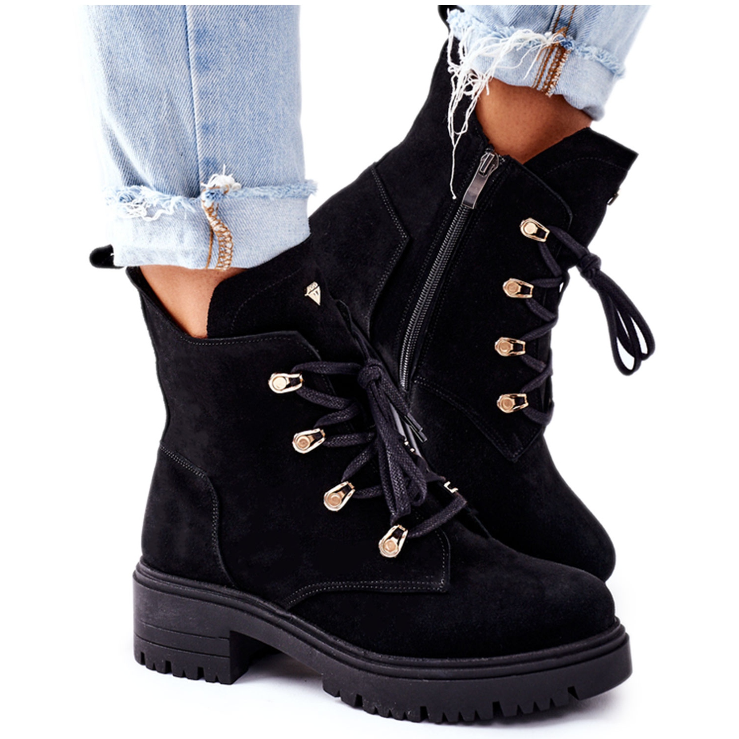 Klassische schwarze Stiefel aus natürlichen Wildleder, die einen stilvollen Look mit praktischen Lösungen kombinieren. Das goldene Logo fügt einen subtilen Stil hinzu, und eine Erwärmung und ein Ledereinsatz bieten an kühleren Tagen Komfort. Perfekt für die Herbst-/Wintersaison - für Arbeiten, für Wanderungen und städtische Stilisierungen.
