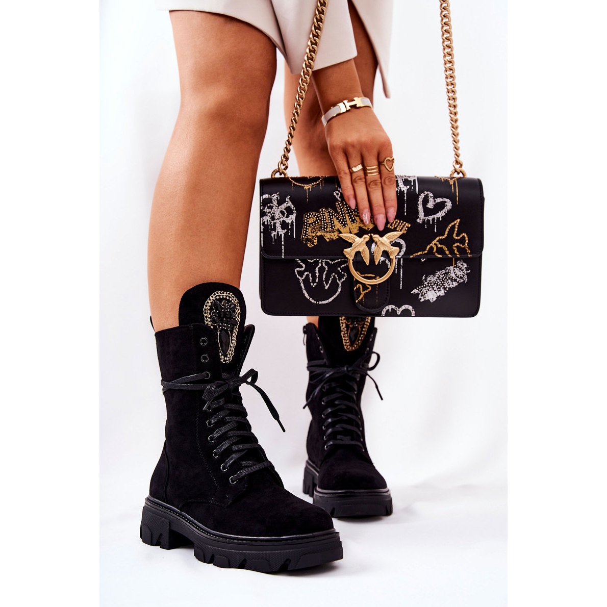 Die Wildlederstiefeletten PL4 Elaina sind die perfekte Wahl für jede modebewusste Frau, die Wert auf Stil und Komfort legt. Diese eleganten schwarzen Stiefel zeichnen sich durch eine einzigartige Verzierung auf der Zunge aus dezenten Perlen, Strasssteinen und einer eleganten Kette aus. Sie bestehen aus hochwertigem Öko-Wildleder und vereinen modernes Design und Langlebigkeit.