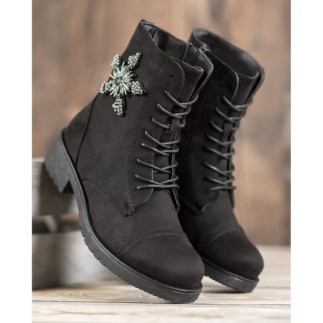 Entdecken Sie einzigartige Eleganz und Stil mit den SHELOVET-Stiefeletten aus schwarzem Wildleder. Aus hochwertigem, ökologischem Wildleder gefertigt, sind diese modischen Damenschuhe eine tolle Wahl für Herbsttage. Ihre Spitzenkonstruktion und die originellen Paillettenverzierungen ziehen die Blicke auf sich und verleihen jedem Styling einen einzigartigen Charakter.