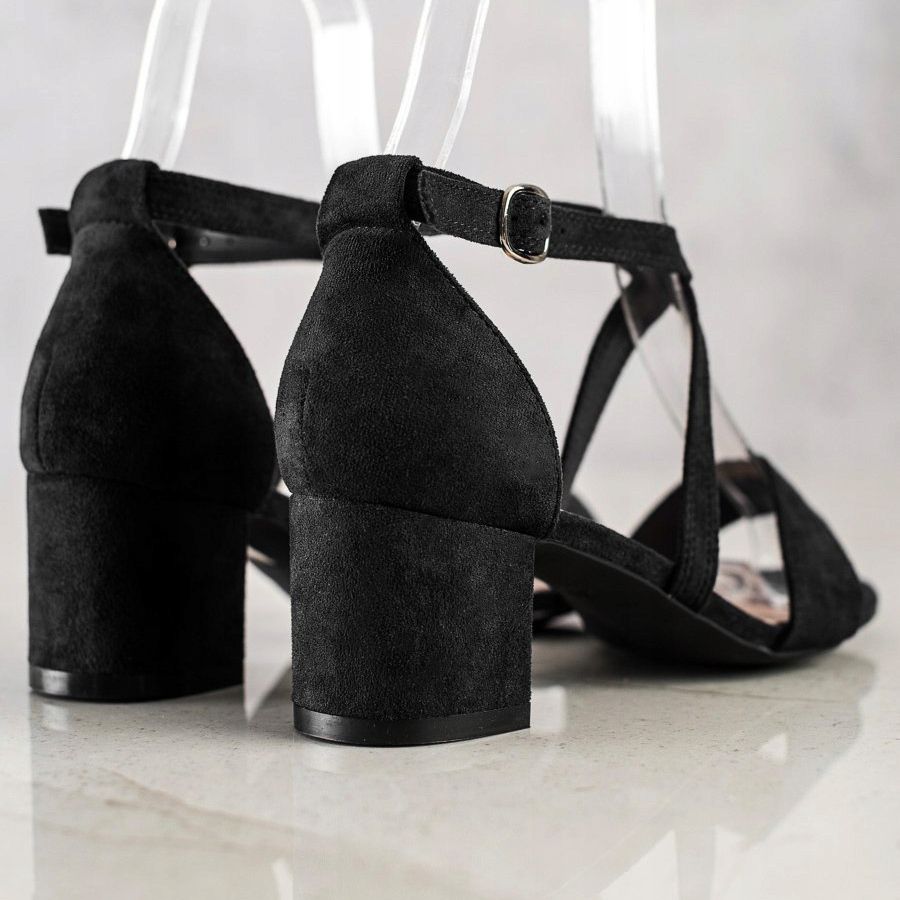 Wir präsentieren schwarze Sandalen mit Riemen der Marke Sergio Leone, die perfekt zu Sommerstilen passen. Sie bestehen aus hochwertigem ökologischem Wildleder und vereinen Eleganz und Komfort. Ihr klassisches Design mit offener Spitze und integriertem Absatz, verziert mit einer goldenen Schnalle am Handgelenk, macht sie zu einer perfekten Wahl für verschiedene Anlässe – von Abendpartys bis hin zu Feiern.