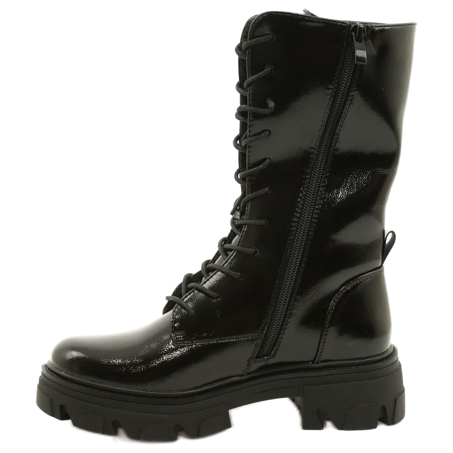 Elegante, weibliche Stiefel in einer modernen Ausgabe. Hergestellt aus lackiertem ökologischem Leder, mit einem weichen Pelzeinsatz und einer Isolierung im oberen Tagen fertiggestellt - perfekt für kühlere Tage. Klassisch auf die Schnürsenkel vorne und ein praktisches Burg geschlossen, was es einfacher macht, schnell zu züchten. Die Kombination von Rockcharakter mit der Bequemlichkeit des täglichen Gebrauchs.