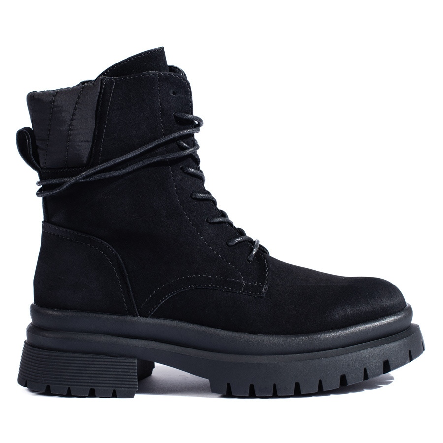 Elegante schwarze Arbeiter aus Shelovet kombinieren einen modischen Look mit praktischen Lösungen. Sie bestehen aus ökologischem Wildlederleder, auf einer leichten, überzeugten Sohle und sind sowohl in der urbanen Stylisationen als auch im täglichen Gebrauch großartig.
