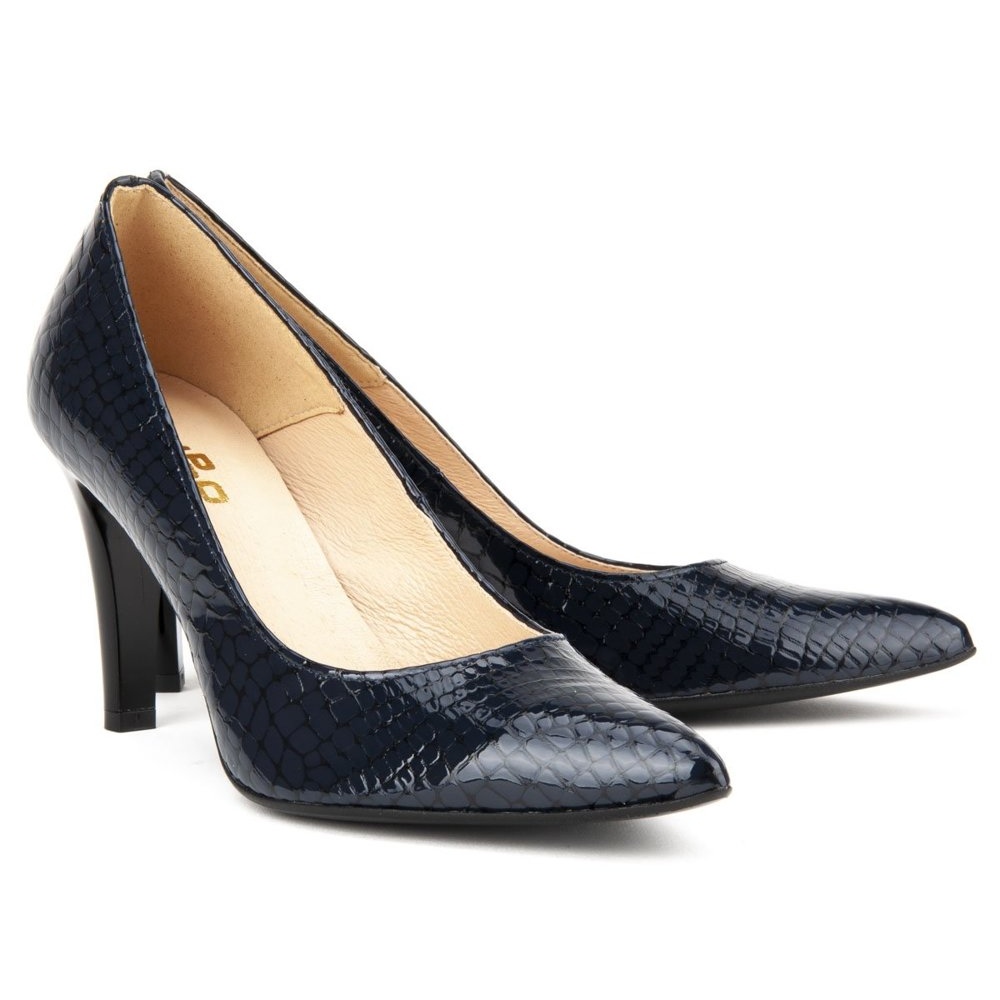 Das Modell F155 Navy Crocodile aus der KeeShoes-Kollektion eignet sich perfekt für elegante Anlässe und passt durch sein klassisches Design zu vielen Stilrichtungen – vom Kleid bis zur Hose. Dank der synthetischen Sohle sind die Pumps leicht und flexibel, was für Stabilität bei jedem Schritt sorgt.