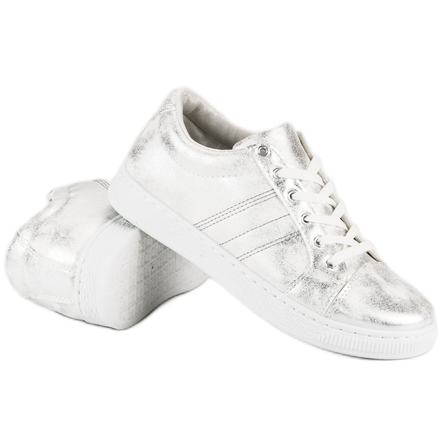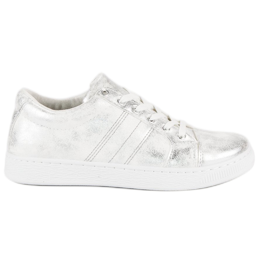 Zu ihrer soliden Konstruktion gehört eine Gummisohle mit Profil, die hervorragenden Halt und Stabilität sowie Tragekomfort garantiert. Dank des abgesenkten Profils und der 2 cm hohen Plattform bieten diese Schuhe ausreichend Halt für die Füße und die runde Spitze verleiht ihnen Leichtigkeit. Silberne Sneaker werden mit traditionellen weißen Schnürsenkeln gebunden, was eine perfekte Passform am Fuß ermöglicht.