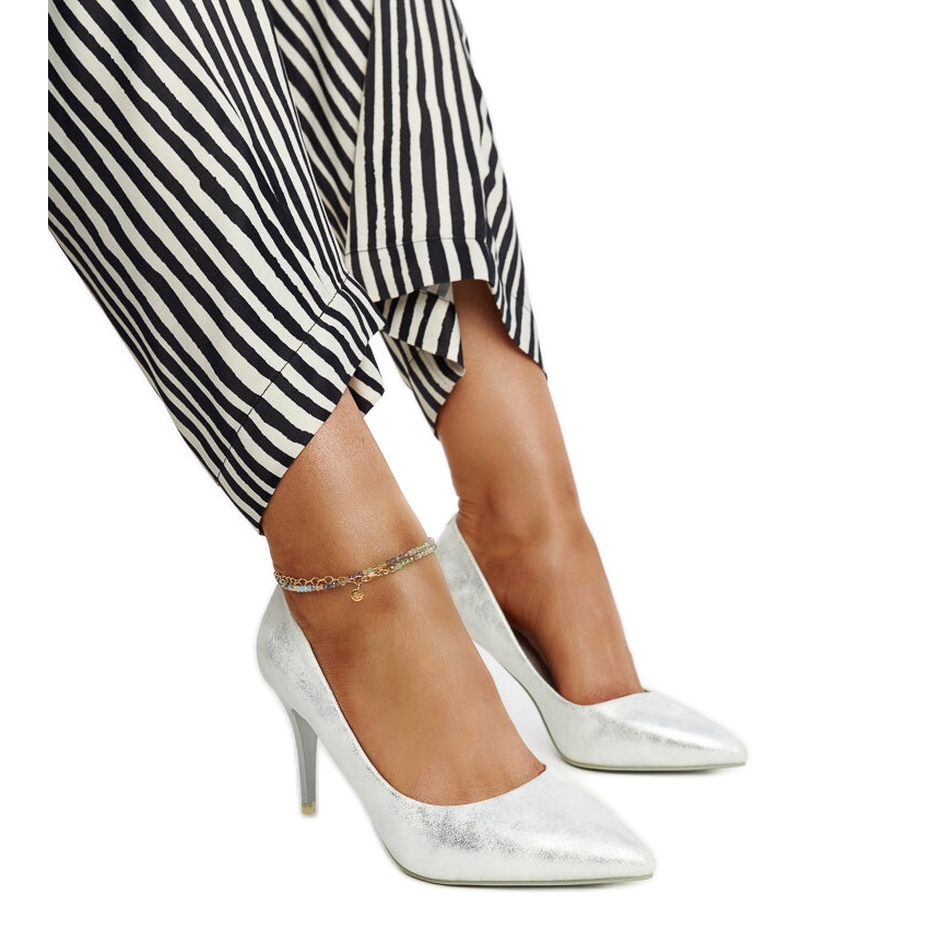 Silver Metallic High Heels mit einer Lederpaume, die in jeder modernen Frauenkollektion muss. Ihre elegante, spitze Nase fügt den gesamten Stil hinzu, und der bequeme Ledereinsatz eignet sich perfekt für besondere Anlässe und jeden Tag. Dank des eingefügten Schnitts ist das Anziehen und Entfernen von Schuhen extrem einfach und komfortabel.