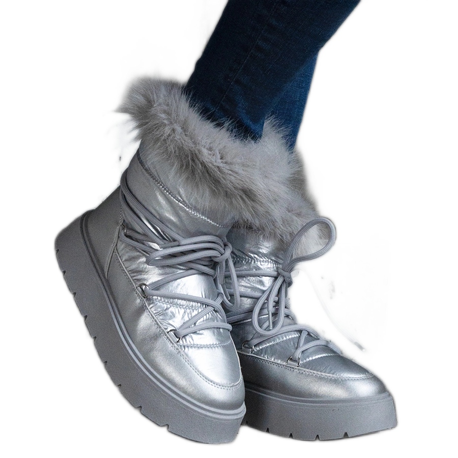Details: Silberne, isolierte Damen-Schneestiefel mit Fell