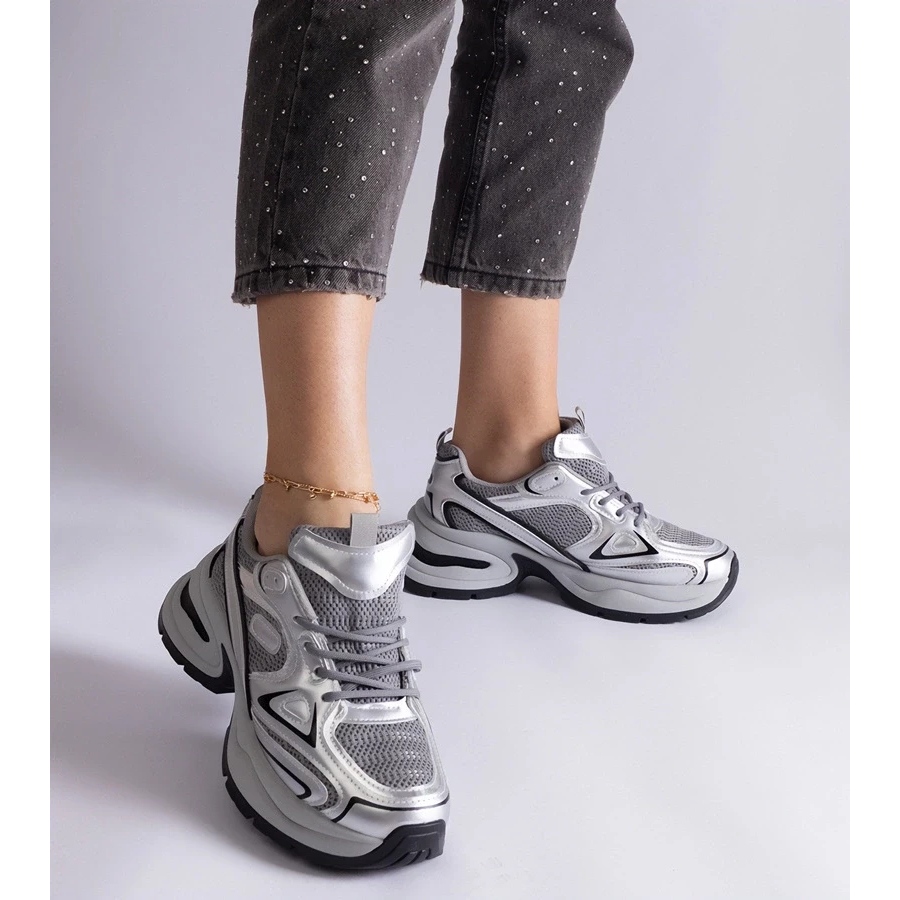 Silber -Turnschuhe auf der massiven Sohle von Adom eines seriösen Herstellers D/CEO sind die perfekte Wahl für moderne Frauen, die Stil und Komfort schätzen. Diese einzigartigen Sportschuhe kombinieren modisches Design mit praktischen Lösungen, was sie zu einer hervorragenden Ergänzung zu jeder Stylisierung macht.