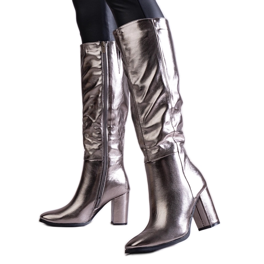 Silbere Stiefel auf dem Toume Leder Post sind eine modische Ergänzung, die sicherlich die Aufmerksamkeit jeder Frau auf sich zieht. Diese eleganten Schuhe, die aus hochwertigem ökologischem Leder bestehen, erfreuen sich mit ihrem metallischen Piter -Finish, was perfekt in aktuelle Trends passt.