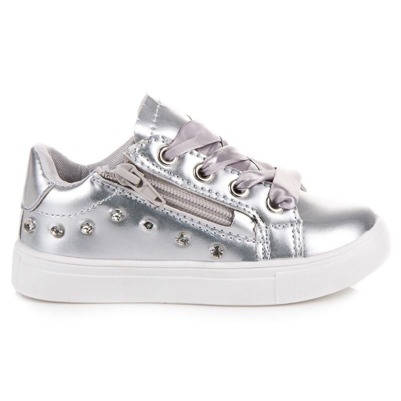Stylische Sneaker für Mädchen, die einen modischen Look mit alltäglichem Komfort verbinden. Das Obermaterial aus ökologischem Leder in einem silbernen, leicht schimmernden Farbton ist außen mit Kristallen verziert und für mädchenhaften Charme sorgt ein attraktives Band anstelle der traditionellen Schnürsenkel. Das Modell ist außerdem mit einem praktischen Reißverschluss ausgestattet, der das An- und Ausziehen der Schuhe erleichtert.