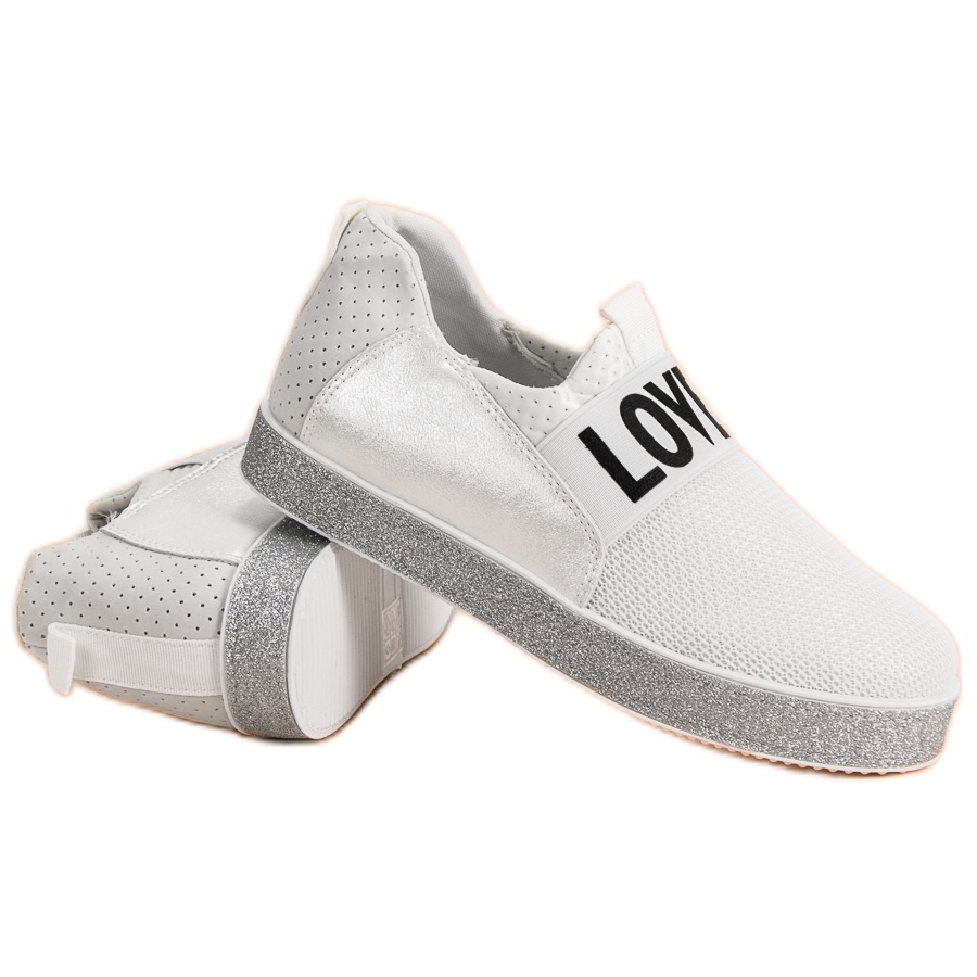 Wir präsentieren Slip-on-Sneaker mit Glitzer in Weiß von Bestelle – die perfekte Wahl für Frauen, die Wert auf Komfort, Stil und etwas Glanz bei ihren Alltagsschuhen legen. Diese äußerst modischen Sneaker zeichnen sich durch einen kräftigen silbernen Akzent aus, der in Kombination mit dem klassischen weißen Lochmuster ein einzigartiges Design ergibt.