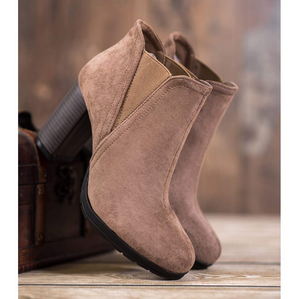 SHELOVET-Stiefel in Braun sind die perfekte Wahl für jede Frau, die Wert auf Stil und Komfort legt. Diese klassischen Slip-On-Stiefeletten aus hochwertigem Öko-Wildleder sind die perfekte Lösung für alle, die sich für tierfreundliche Produkte entscheiden. Ein stabiler 8,5 cm hoher Absatz sorgt für Tragekomfort auch über längere Zeit und macht sie zu einer tollen Wahl für den Alltag.
