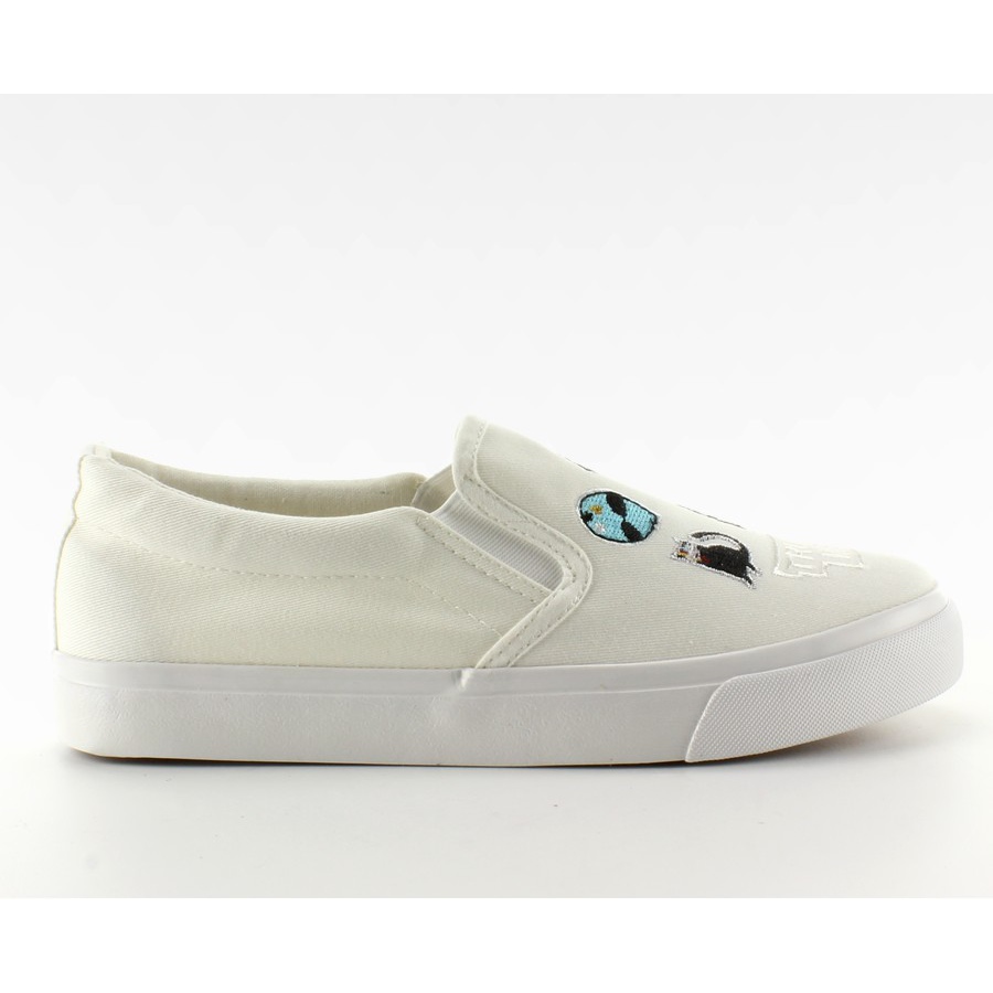 NB102P Weiße Slip-On-Sneaker mit Stickerei – weiß, stilvoll und bequem. Hergestellt aus dickem Canvas, mit einer dicken und weichen Sohle (2 cm), die jeden Schritt absorbiert. Slip-on-Modell – perfekt, wenn Sie Wert auf schnelle und bequeme Lösungen legen. Der modischste Akzent der Saison: Stickereien – jeder Schuh hat ein anderes Muster, das dem Paar einen originellen, einzigartigen Charakter verleiht.