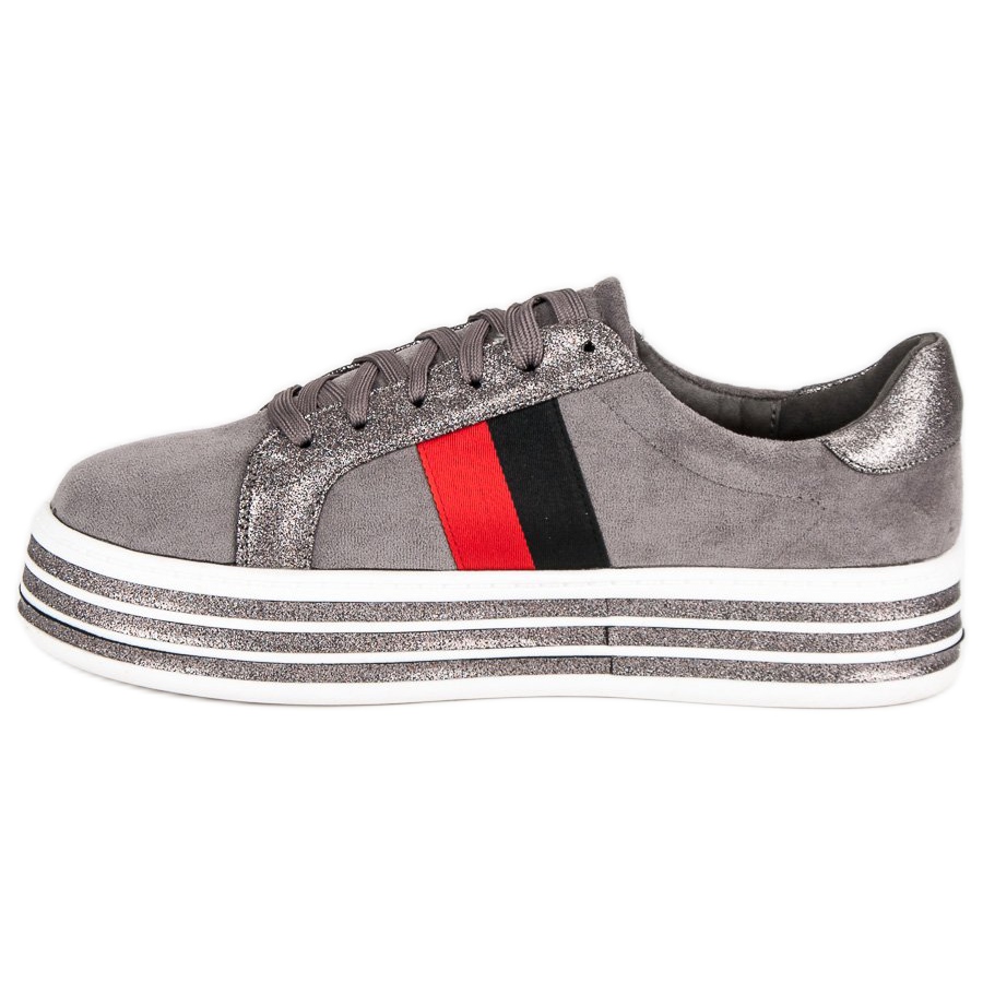 Suchen Sie Schuhe, die Komfort mit einem modischen Look verbinden? VICES Plateau-Sneaker in Grau sind die perfekte Wahl für jede Frau, die ihren originellen Stil in Alltagsoutfits betonen möchte. Dank der farbenfrohen und glänzenden Details werden diese Schuhe sicherlich die Aufmerksamkeit auf sich ziehen und zu einer attraktiven Ergänzung Ihrer Garderobe werden.