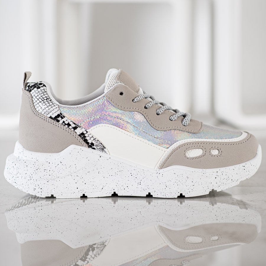 Entdecken Sie die Welt des Stils und Komforts mit den Kayla-Sneakern mit Holo-Effekt in Weiß, Grau und Mehrfarben. Diese modischen Sportschuhe sind die perfekte Wahl für moderne Frauen, die Eleganz mit Alltagskomfort verbinden möchten. Der obere Teil der Sneakers besteht aus hochwertigen Materialien und besteht zu 50 % aus Kunstleder und zu 50 % aus Textilmaterial, was für Atmungsaktivität und Haltbarkeit sorgt.