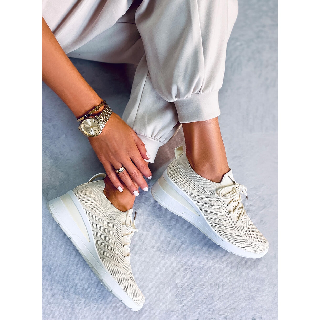 - Die beige Farbe von Sportschuhen ist universell und passt zu vielen Stilen, behält aber gleichzeitig einen eleganten Ton bei.