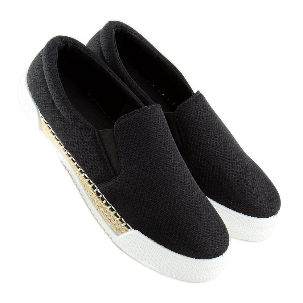 Schwarze Slip-On-Sneaker 15691A Black sind eine ideale Option für Frauen, die Wert auf Komfort gepaart mit einem modischen Erscheinungsbild legen. Dieses aus hochwertigem Stoff gefertigte Modell zeichnet sich durch ein um die Sohle geflochtenes Band aus, das ihm einen einzigartigen Stil und eindrucksvollen Charakter verleiht. Dank der flexiblen Sohle bieten die Sneaker einen hervorragenden Tragekomfort und sind dank des Slip-On-Designs einfach und schnell anzuziehen.