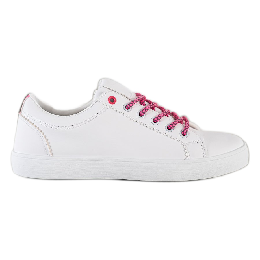 Hier ist ein ideales Angebot für Frauen, die sowohl Wert auf Komfort als auch auf modisches Aussehen legen – SHELOVET-Sneaker mit dekorativer weißer Spitze. Diese lässigen Sportschuhe sind aus hochwertigem Material im Lederimitat gefertigt, was sie nicht nur stilvoll, sondern auch langlebig macht. Das weiße Obermaterial passt perfekt zu bunten Gürtelschlaufen und gemusterten Schnürsenkeln in Lilatönen, die einen auffälligen Akzent setzen.
