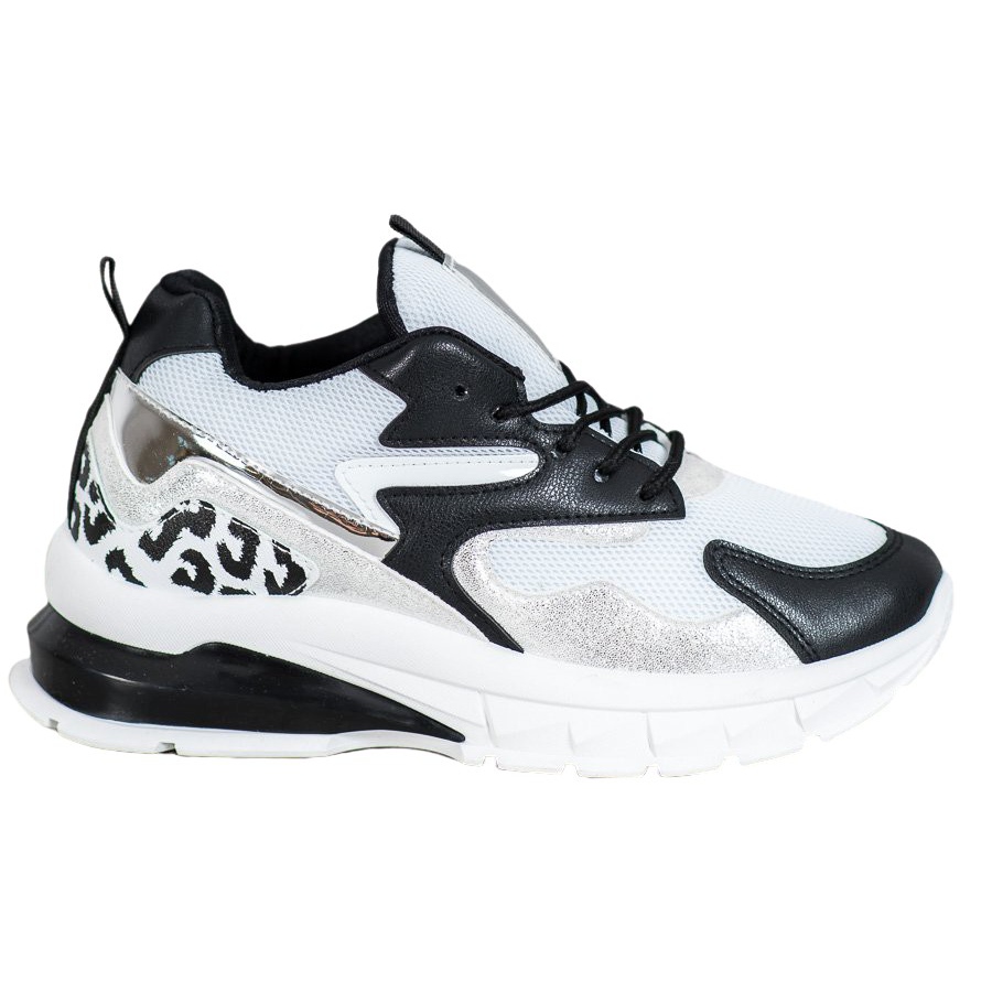 Der aus hochwertigem Material gefertigte Außenteil der Schuhe besticht durch ein weißes Obermaterial, das mit schwarzen Einsätzen in verschiedenen Formen und Größen verziert ist. Zusätzlich gibt es silberne Akzente an der Seite und oberhalb der Ferse, die den Sneakern einen einzigartigen, modernen Look verleihen. Eine weiche, geschlossene Fersenkappe und eine originelle Verzierung mit gepunktetem Motiv sorgen für Tragekomfort und ziehen gleichzeitig die Blicke auf sich.
