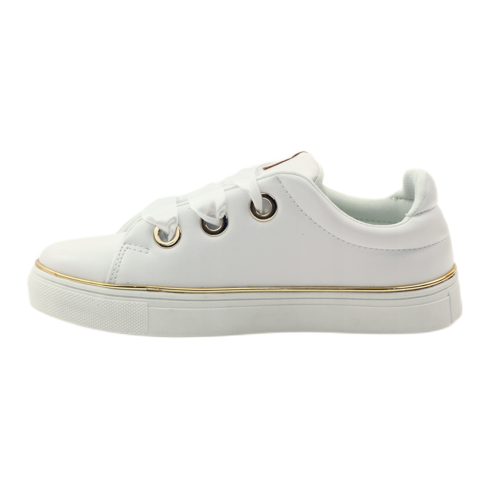 Anstelle traditioneller Schnürsenkel verwendete der Hersteller ein zartes Satinband, das durch stilvolle, dicke goldene Ösen gefädelt wird, was den Sneakern einen einzigartigen Charakter verleiht. Die Sneaker sind auf einer etwas dickeren, weißen, flexiblen Gummisohle montiert, was sie nicht nur modisch, sondern auch praktisch und angenehm zu tragen macht.