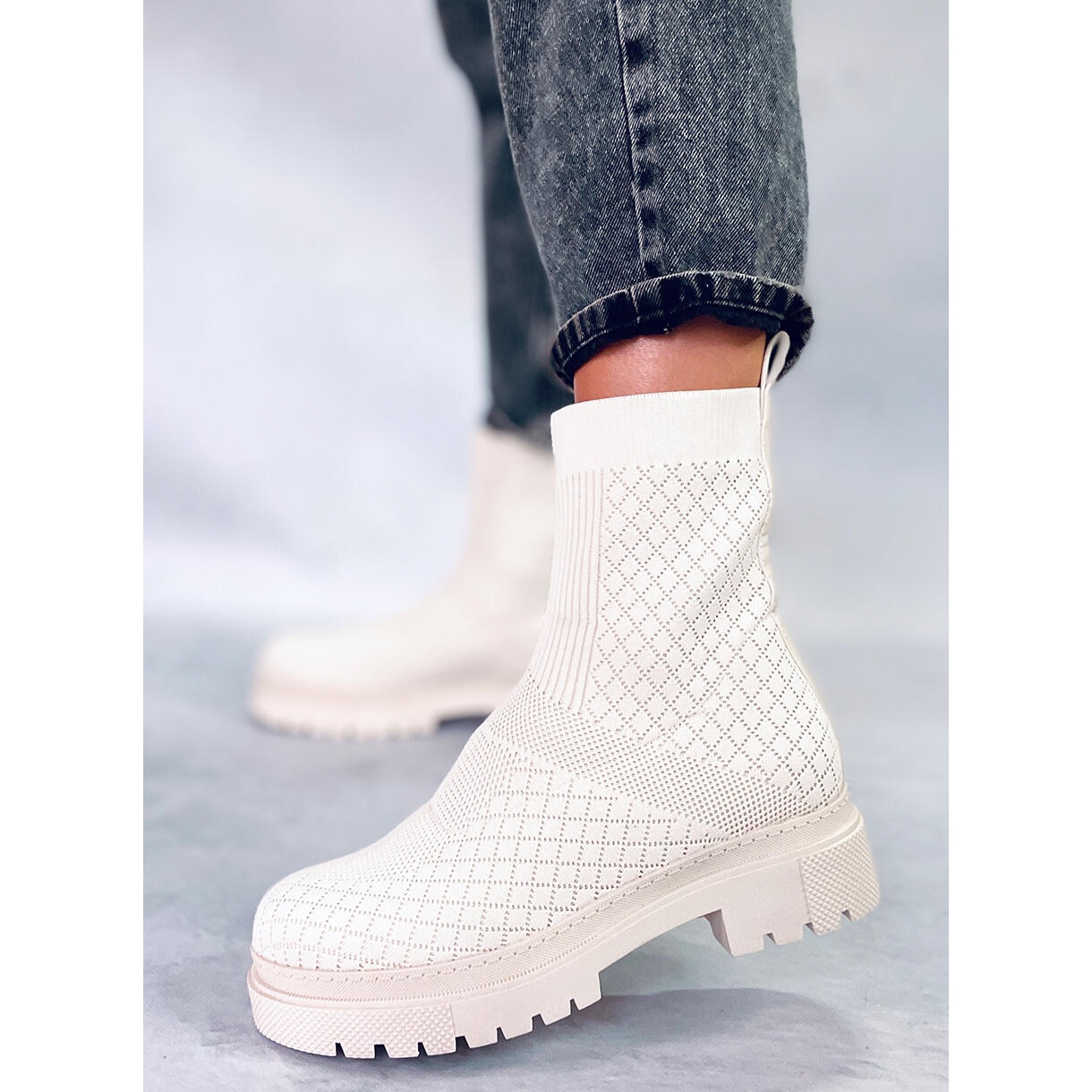 Moderne Raeda Beige Sockenstiefel von der Keeshoe-Kollektion bis zu einem Must-Have dieser Saison. Sie bestehen aus flexibelem Stoff mit einem subtilen, offenen Motiv mit offenem Werk und passen sich perfekt an das Bein an und erzeugen den Effekt von "Socken". Das Knöchelmodell auf einer flachen, hohen Sohle (Plattform/3,5 cm Ferse) mit einem abgerundeten Zeh. Der Innenraum ist teilweise mit feinem Fell isoliert, was den thermischen Komfort und die angenehme Verwendung an kühleren Tagen gewährleistet.