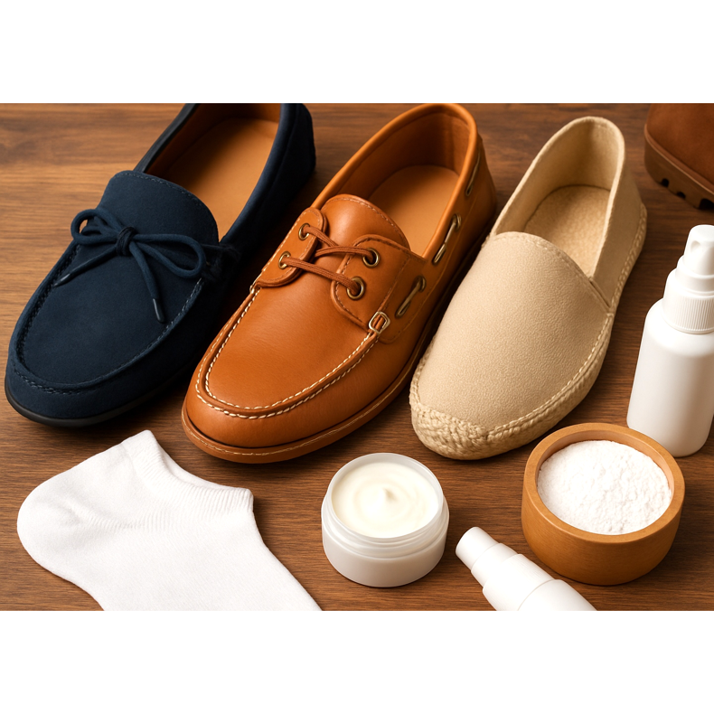 Viele Sommerschuhe (Mokassins, Bootsschuhe, Espadrilles) können ohne Socken oder mit unsichtbaren Socken getragen werden. Wählen Sie Modelle mit weichem Futter, das nicht scheuert.