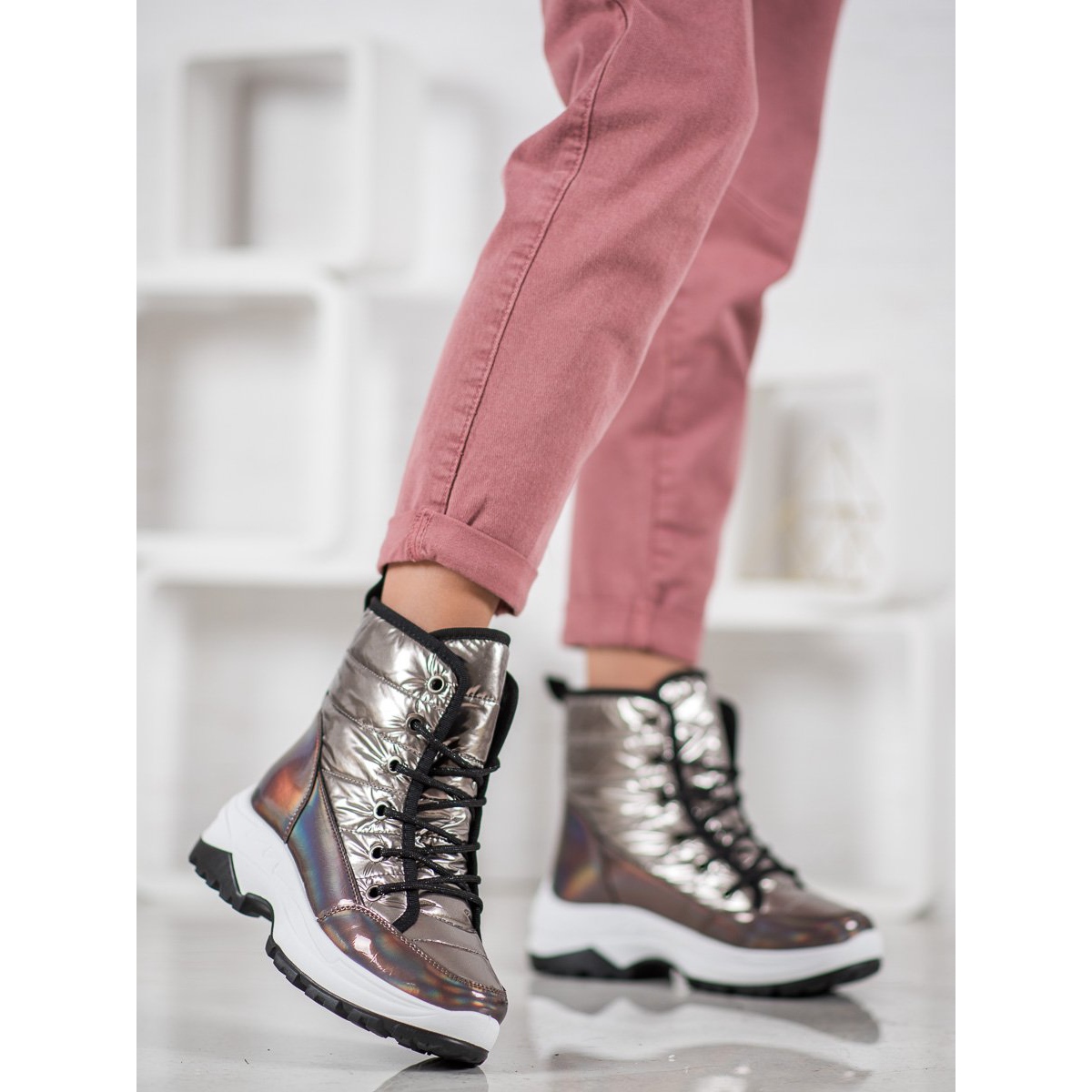 Das Obermaterial aus Stoff und eine Synthetiksohle mit Profil garantieren Langlebigkeit und guten Grip, was sie zu einer idealen Wahl für winterliche Bedingungen macht. Die obere Höhe von 12–13 cm und die Plattformhöhe von 3 cm verleihen jeder Stufe Subtilität und Leichtigkeit. Darüber hinaus werden diese Schneestiefel dank der originellen goldenen Farbe sicherlich die Aufmerksamkeit auf sich ziehen und zum Mittelpunkt jedes Stylings werden.