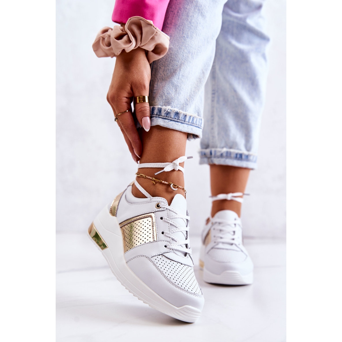 Wir präsentieren das Modell S.Barski Damen-Sportschuhe aus Leder mit Keilabsatz in eleganten weißen Farben mit einem spiegelgoldenen Akzent, das eine perfekte Kombination aus klassischem und modernem Stil darstellt. Aus hochwertigem, natürlichem, perforiertem Leder gefertigt, bieten diese leichten Sneaker nicht nur hervorragenden Tragekomfort, sondern auch einen stilvollen Look.