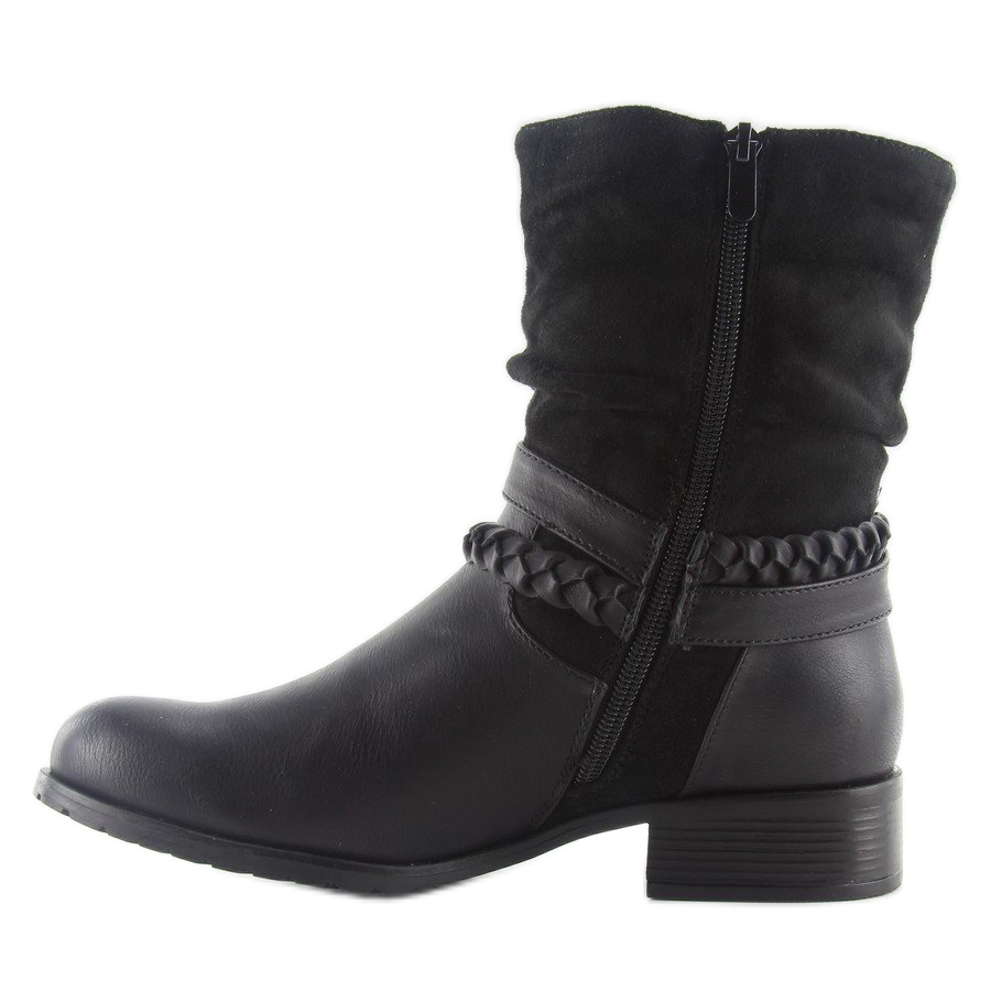 Die schwarzen Stiefeletten 632-pa haben einen 3 cm hohen flachen Absatz, was sie zu einer idealen Wahl für Alltagsausflüge und lange Spaziergänge macht. Die runde Nase verleiht ihnen einen klassischen Charakter und das Fehlen von Mustern ermöglicht eine einfache Kombination mit verschiedenen Stilen. Es handelt sich um ein universelles Modell, das sicherlich in jeder Garderobe seinen Platz finden wird.