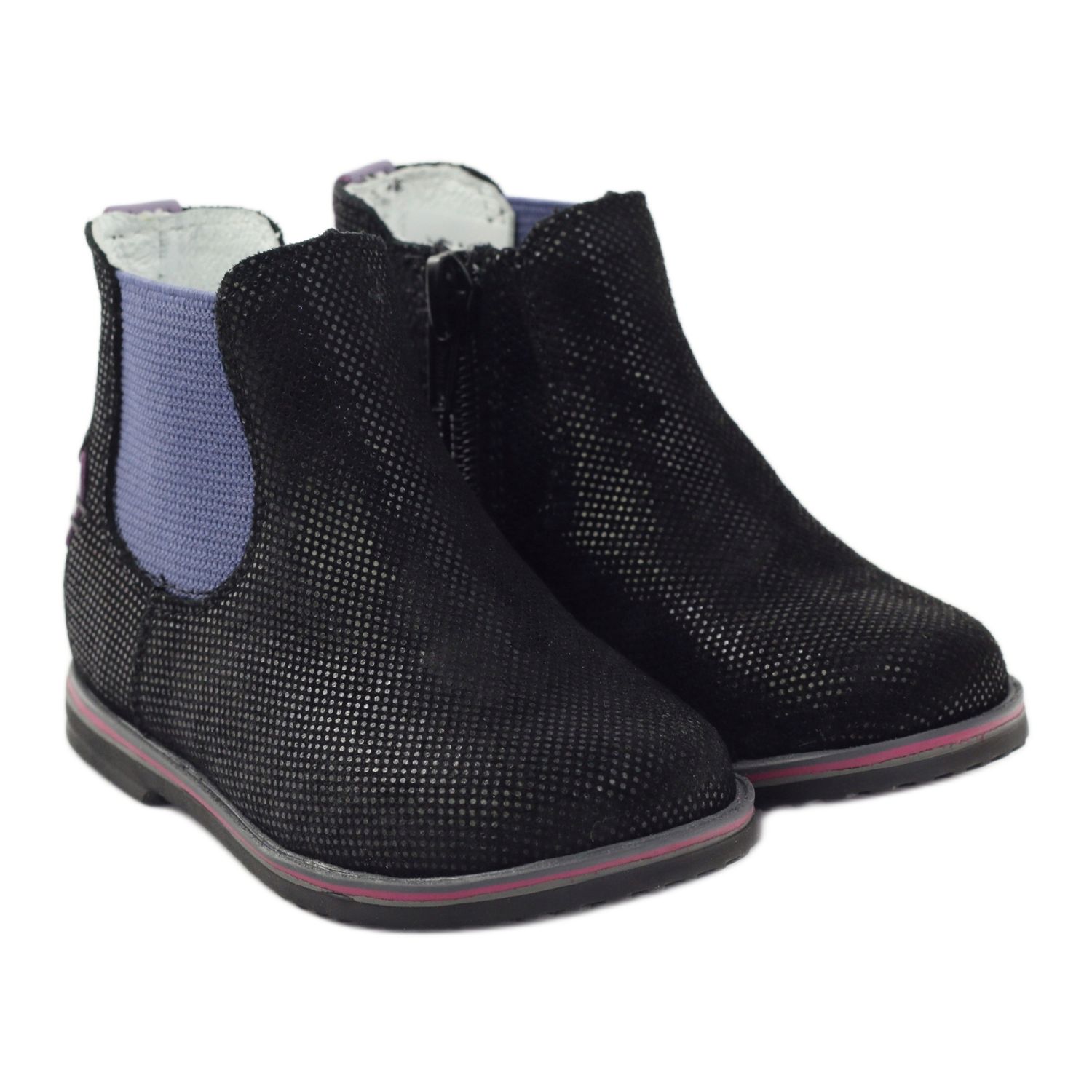 Durch die versteifte Ferse und die profilierte Innensohle bieten die Stiefel dem jungen Fuß den richtigen Halt. Natürliche Materialien erhöhen den Tragekomfort und die Atmungsaktivität, und die antibakterielle Einlage sorgt für Hygiene. Der seitliche Reißverschluss erleichtert den täglichen Gebrauch und die universelle schwarze Farbe mit einem violetten Akzent passt gut zu vielen Schul- und Partystilen.