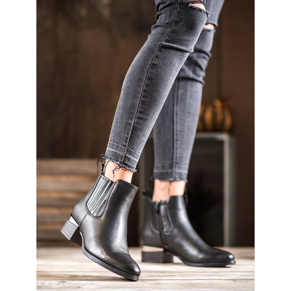 Super Mode Stiefeletten mit dekorativem Absatz sind die perfekte Wahl für jede Frau, die stilvolle und bequeme Schuhe für kältere Tage sucht. Sie sind aus hochwertigem ökologischem Leder gefertigt und vereinen Eleganz und Alltagskomfort perfekt. Das schwarze Obermaterial reicht bis über den Knöchel und ist daher eine perfekte Ergänzung zu verschiedenen Stilen – von lässig bis elegant.