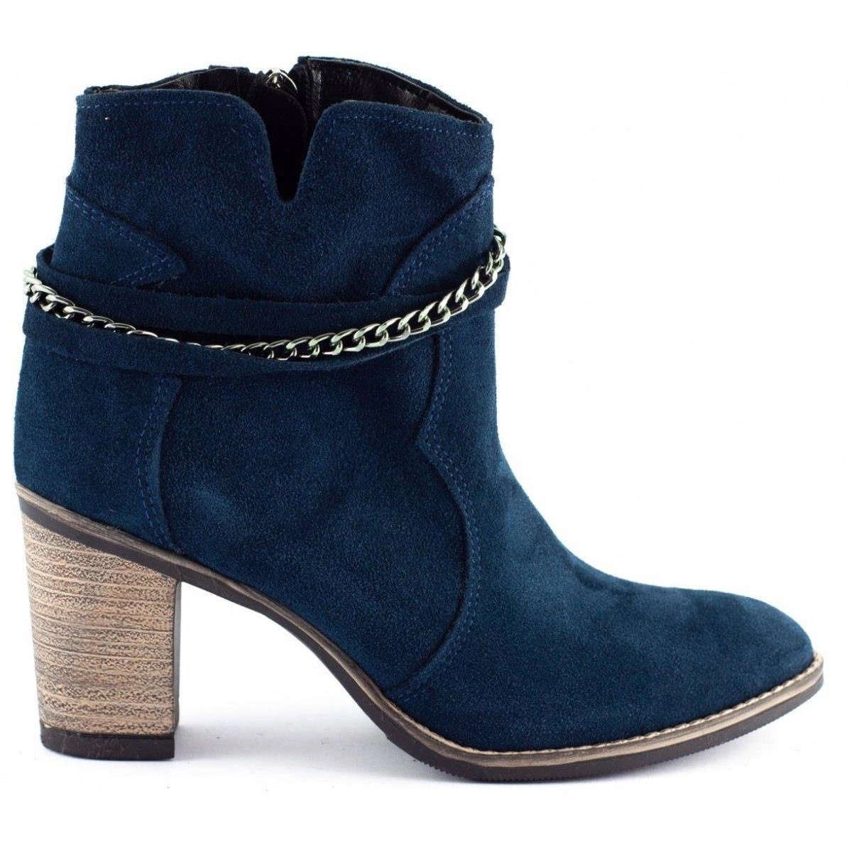 Stilvolle Stiefel, die leicht über den Knöcheln liegen, was die Eleganz mit Komfort verbinden. Hergestellt aus Nubuk, manuell, in einem klassischen dunkelblauen Farbton, ergänzen sie perfekt die Herbst- und Winterstilisationen - sie passen sowohl Röcke als auch Hosen. Die dekorative Kette verleiht ihnen einen subtilen Stil und Charakter.