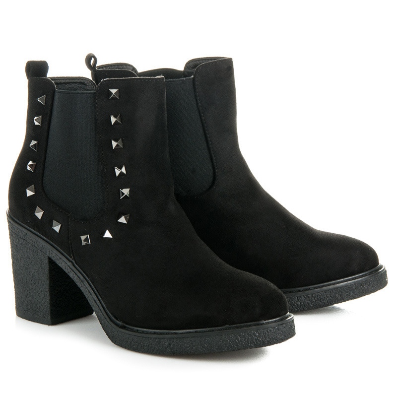 Das dominierende Muster ist klassisches Schwarz, ergänzt durch auffällige Nieten, die den Schuhen einen einzigartigen Charakter verleihen. Stiefeletten mit Schlupfverschluss machen das An- und Ausziehen der Schuhe besonders einfach und bequem.
