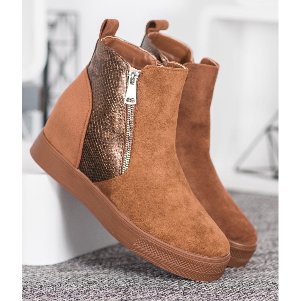 Entdecken Sie Eleganz und Komfort in perfekter Kombination mit braunen Stiefeletten mit Schlangenmotiv von Bestelle. Aus hochwertigem Faux-Wildleder gefertigt, überzeugen diese stylischen Schuhe nicht nur durch ihr modisches Design, sondern sorgen auch für Tragekomfort. Durch ihren harmonischen Braunton passen sie perfekt zu den unterschiedlichsten Stilrichtungen, von lässig bis elegant.