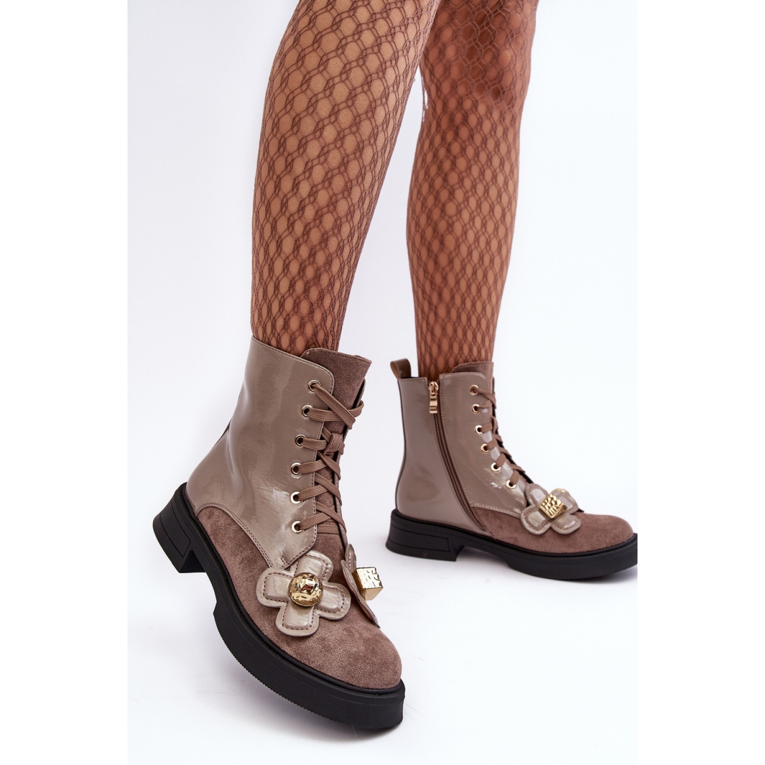 Eine flache Ferse mit einer Höhe von 4,5 cm und einer 2,5 -cm -Plattform sorgt für hervorragende Stabilität und Komfort. Dank der Schnürung vorne und eines praktischen Schiebers von der Seite des Oberen wird das Anziehen und Ausziehen von Schuhen extrem einfach. Der Innenraum der Stiefel ist mit einer weichen Schuhedecke gepolstert, wodurch sich die Füße auch den ganzen Tag angenehm anfühlen.