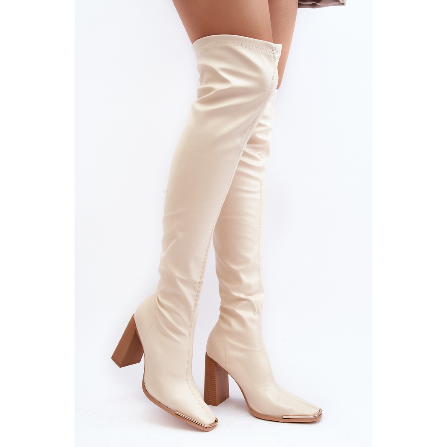Das hohe Obermaterial mit sorgfältiger Nähte, erreicht 57 cm, betont die Form der Beine, und quadratische Zehen verleihen dem Modell einen modernen Charakter. Eine stabile Ferse in Form eines 10,5 cm hohen Pfostens bietet im täglichen Gebrauch Komfort. Dank des praktischen Gleitens ist das Anlegen und Entfernen von Stiefeln extrem einfach.