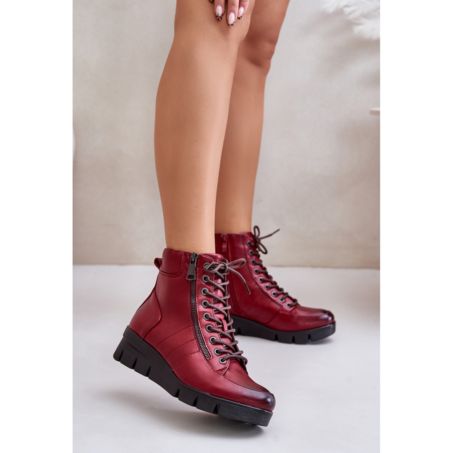 Praktische Reißverschlüsse und Schnürfäden ermöglichen es Ihnen, perfekt zum Fuß zu passen, was den Nutzungskomfort erhöht. Abgerundete Zehen garantieren die Bewegungsfreiheit, was diese Stiefel perfekt für längere Spaziergänge perfekt macht. Die Mitte des Schuhe ist mit einer weichen Schuhdecke gefüllt, die selbst an kühleren Tagen eine angenehme Wärme bietet.