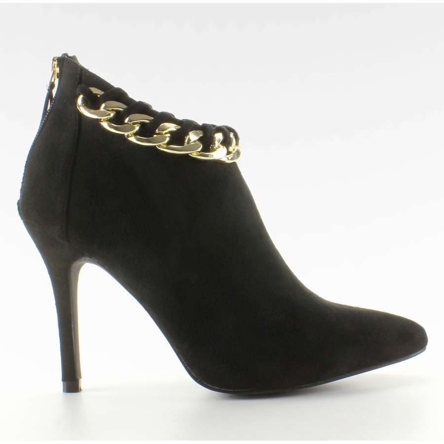 Schwarze Wildleder-Stiefeletten mit hohem Absatz und Kette – schwarze Damen-Stiefeletten