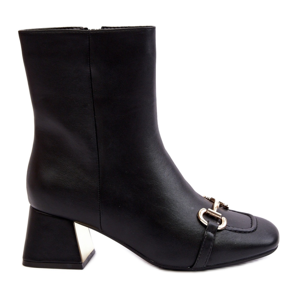 Schwarze Stiefel sind nicht nur eine modische Ergänzung, sondern auch praktische Schuhe. Mit einem Schieberegler von der Seite befestigt, machen Sie es einfacher, einzuziehen und abzunehmen. Sie zeichnen sich durch einen quadratischen Zeh aus, der ihnen die Moderne verleiht. Die versteifte Ferse sorgt für Stabilität und Komfort des Tragens. Darüber hinaus führt ein elegantes Ornament in goldener Kunststofffarbe einen subtilen Akzent ein, der die Aufmerksamkeit aller auf sich zieht.