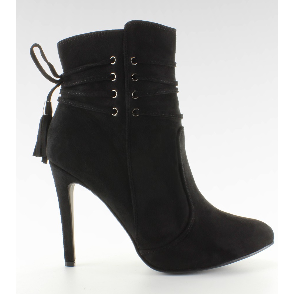 High Heel Stiefeletten 4074 Schwarz – sinnlich, elegant und praktisch. Klassische schwarze Stiefel aus ökologischem Wildleder, mit Isolierung aus zartem Fell, perfekt für kältere Tage. Ein 10 cm hoher Stiletto-Absatz schmälert die Figur und dezente Schnürsenkel mit Fransen am Knöchel setzen einen stilvollen Akzent. Auf der Innenseite befindet sich ein Reißverschluss, der ein schnelles Anziehen ermöglicht.