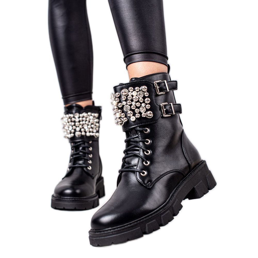 Durch ihre schwarze Farbe passen sie zu fast jedem Stil, von lässig bis elegant. Verziert mit Strasssteinen, Strasssteinen und Nieten sind diese Arbeiter ein Blickfang und verleihen jedem Outfit einen Hauch von Eleganz.