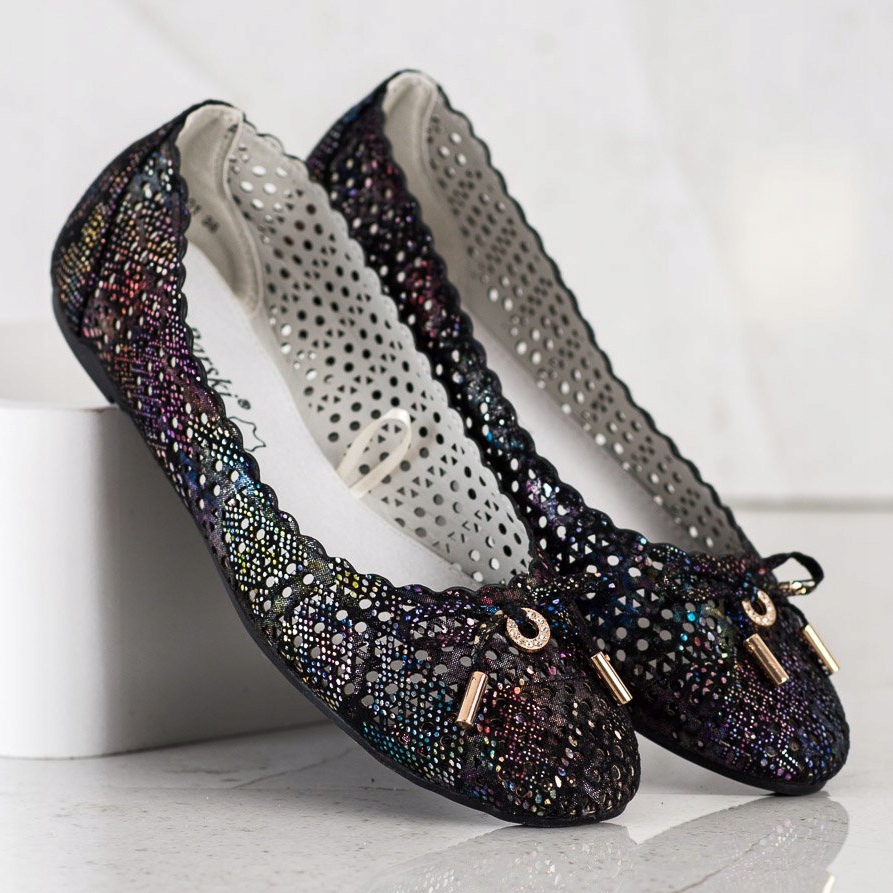 Stilvolle, durchbrochene, mehrfarbige Ballerinas von S. BARSKA sind ein ideales Angebot für Frauen, die Komfort und Eleganz für Frühlings- und Sommertage suchen. Diese modernen Ballerinas zeichnen sich durch ihr einzigartiges Design aus – das Obermaterial ist mit einem durchbrochenen Muster in Schwarztönen bedeckt, das in der Sonne schimmert und so einen spektakulären, farbenfrohen Effekt erzeugt.