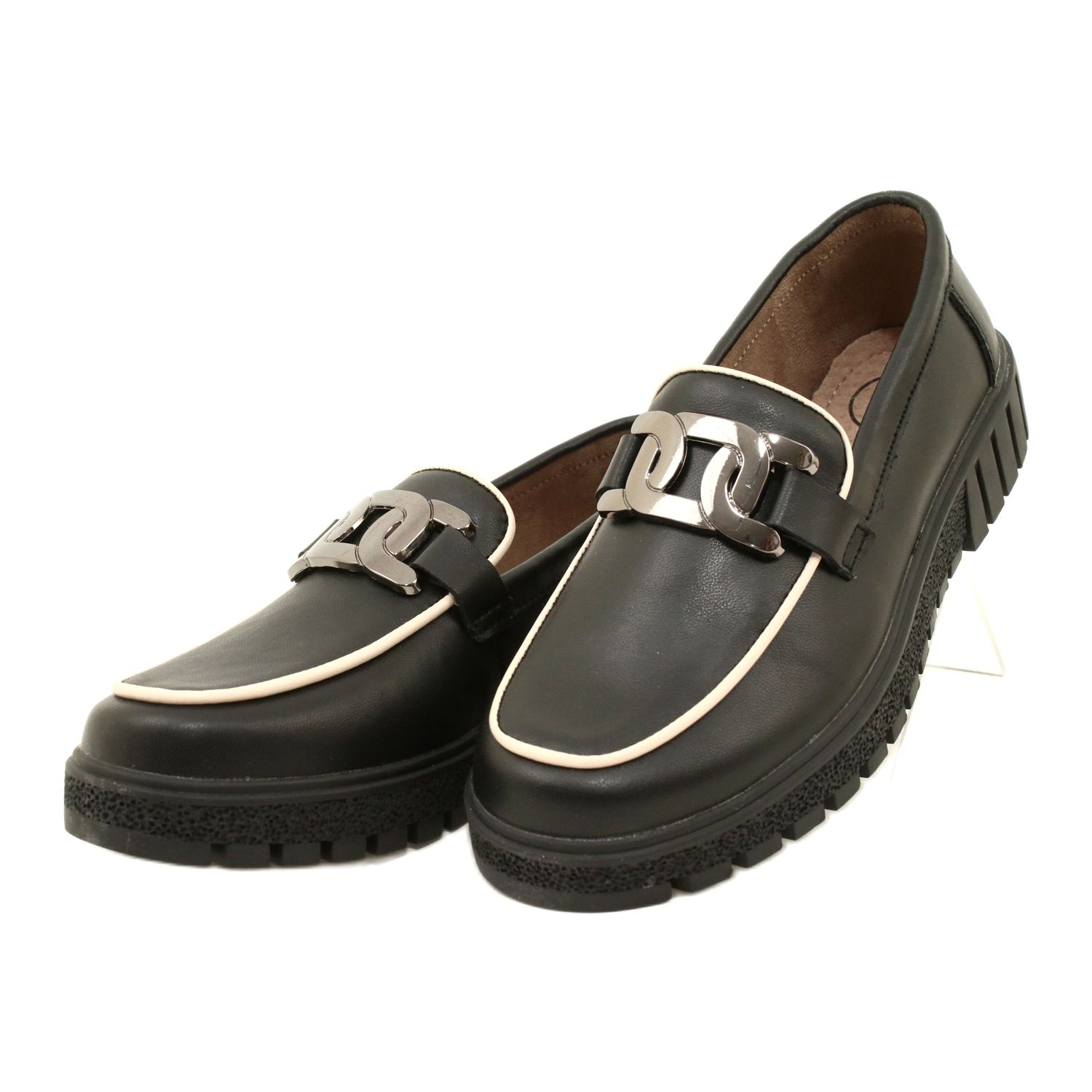 Elegante Slipper aus Filippo, die eine klassische Form mit einem frischen, modischen Akzent kombinieren. Hergestellt aus natürlicher Getreideleder, in der schwarzen Version mit kontrastierenden beige Trimmen und einer zarten Kette auf der Zunge - Details, die den Schuhen einen originellen Charakter verleihen. Die dickere, leichte Sohle mit einer Höhe von 3,5 cm bietet ein modernes Aussehen und den Komfort des Tragens im Laufe des Tages.