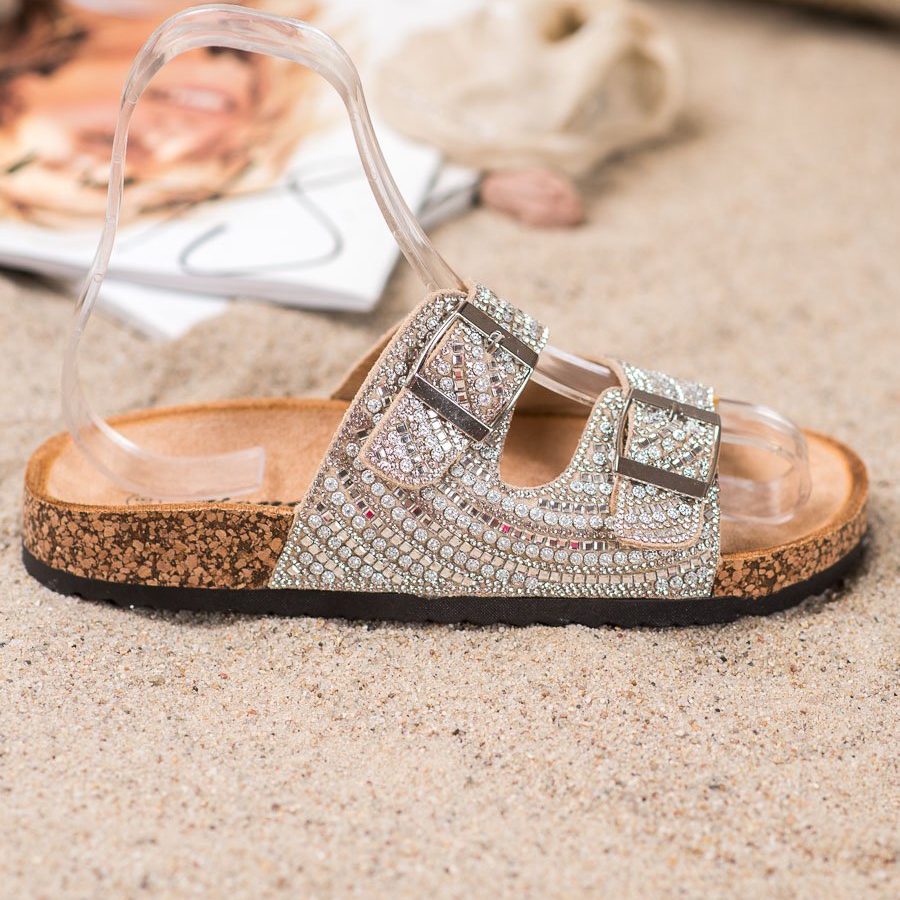 Zwei mit glänzenden Kristallen und Strasssteinen verzierte Schnallen verleihen ihnen einen einzigartigen Stil und machen sie zu einem Lieblingselement Ihrer Sommergarderobe. Die Klappen lassen sich leicht an- und ausziehen, und die offene Ferse sorgt für Atmungsaktivität, perfekt für warme Tage.