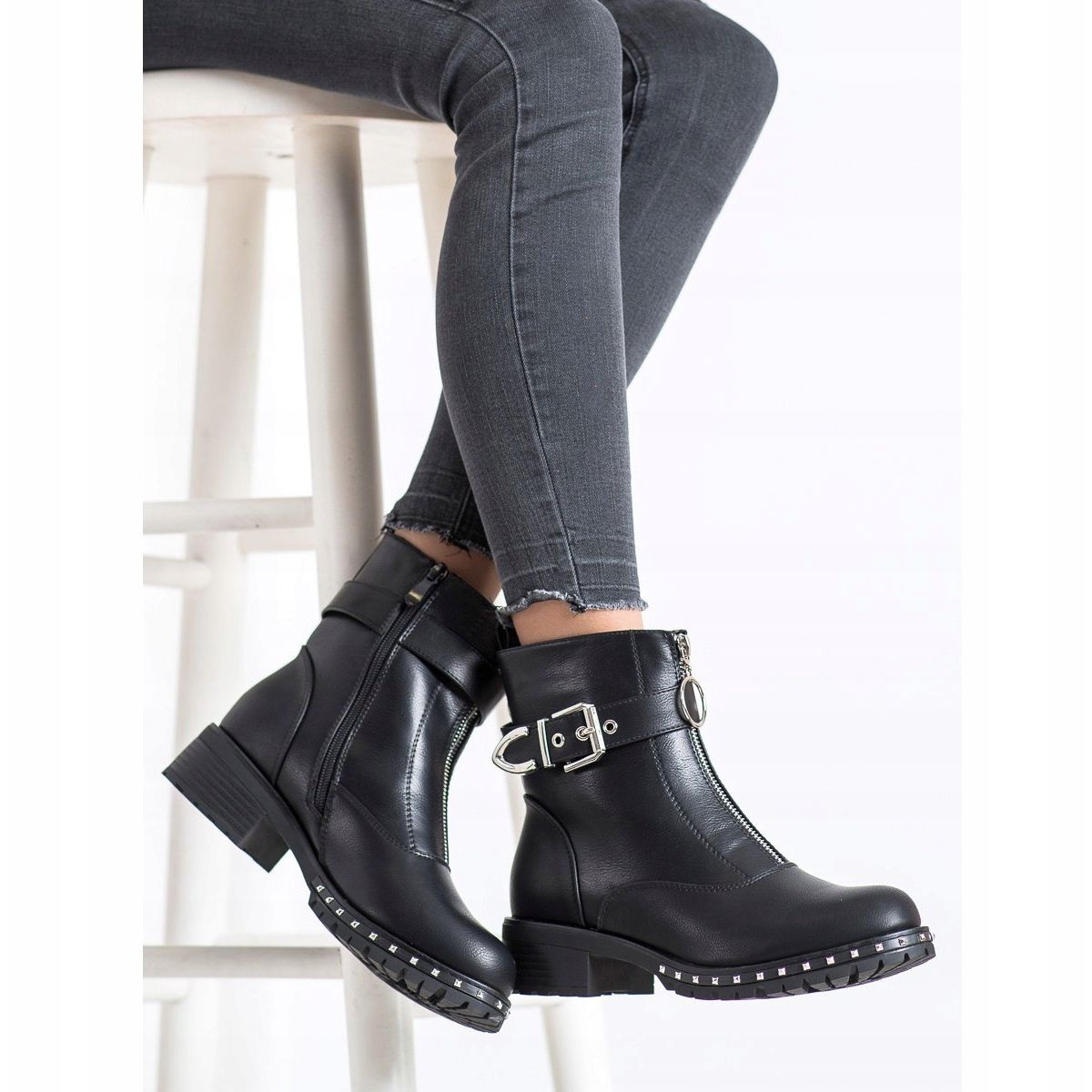 Schwarze Kayla-Worker zeichnen sich durch dekorative Details wie silberne Nieten, eine Schnalle und einen spektakulären Reißverschluss aus, die einen modischen Touch verleihen. Die Schnalle und der Reißverschluss erleichtern das Anziehen und die Breite des Obermaterials (26 cm) und die Weite G sorgen für Tragekomfort.