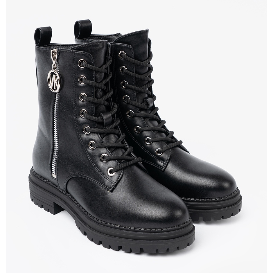 Schwarze Shelvt -Arbeiter haben eine runde Nase und eine praktische Befestigung in Form von Schnürung und Schieberegler, was das Anziehen erleichtert. Dank der Breite der oberen 26 cm passen sie sich perfekt an den Fuß an, und ihre ursprüngliche Verpackung in Form einer Schachtel macht sie für das perfekte Geschenk geeignet.